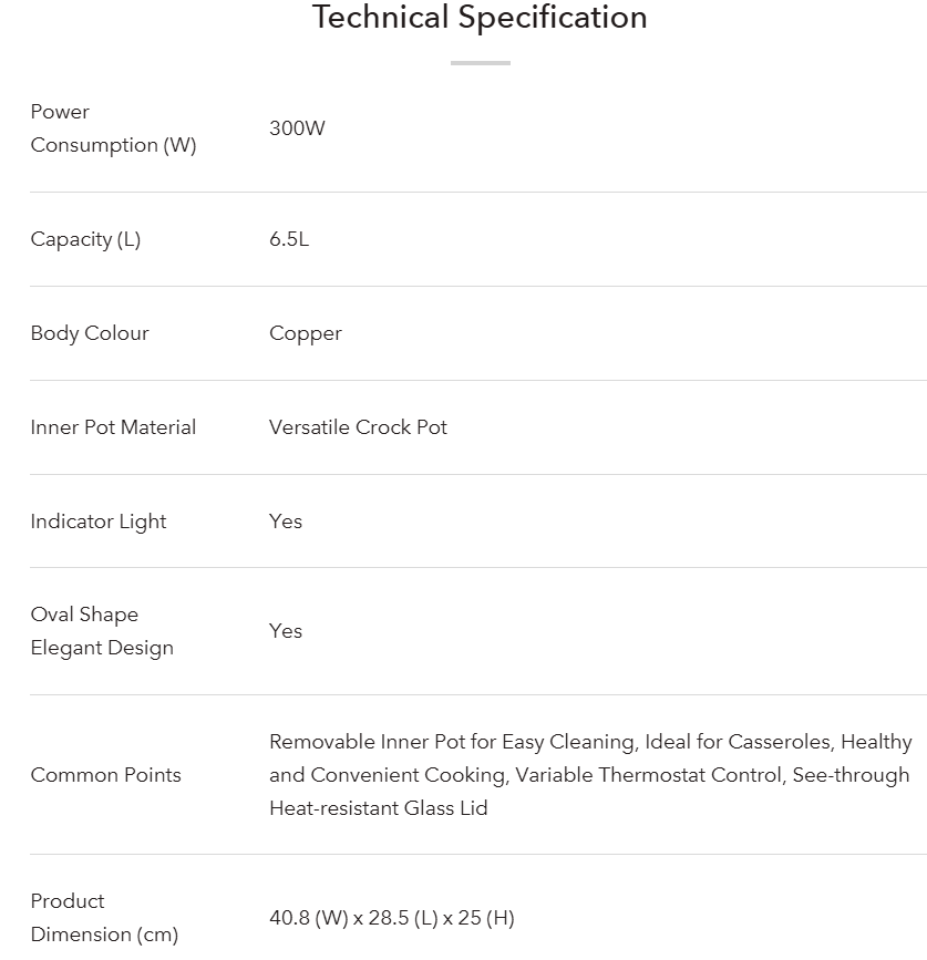 ELBA 6.5L SLOW COOKER ESCO-K6568(CP) - VARIABLE THERMOSTAT CONTROL (6.5L/300W)