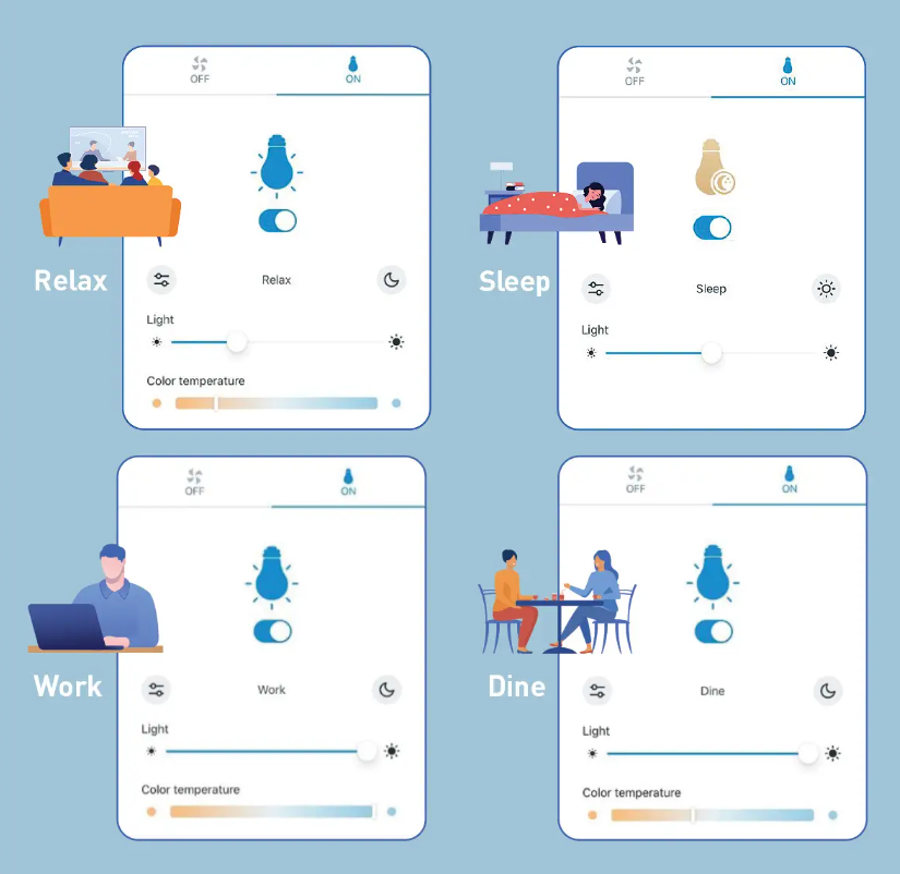 Preset with 4 light setting for 4 common daily activities. The preset scene can also be overwritten by adjusting the light setting according to your preferred comfort level and save the setting for easy 1-Touch access.