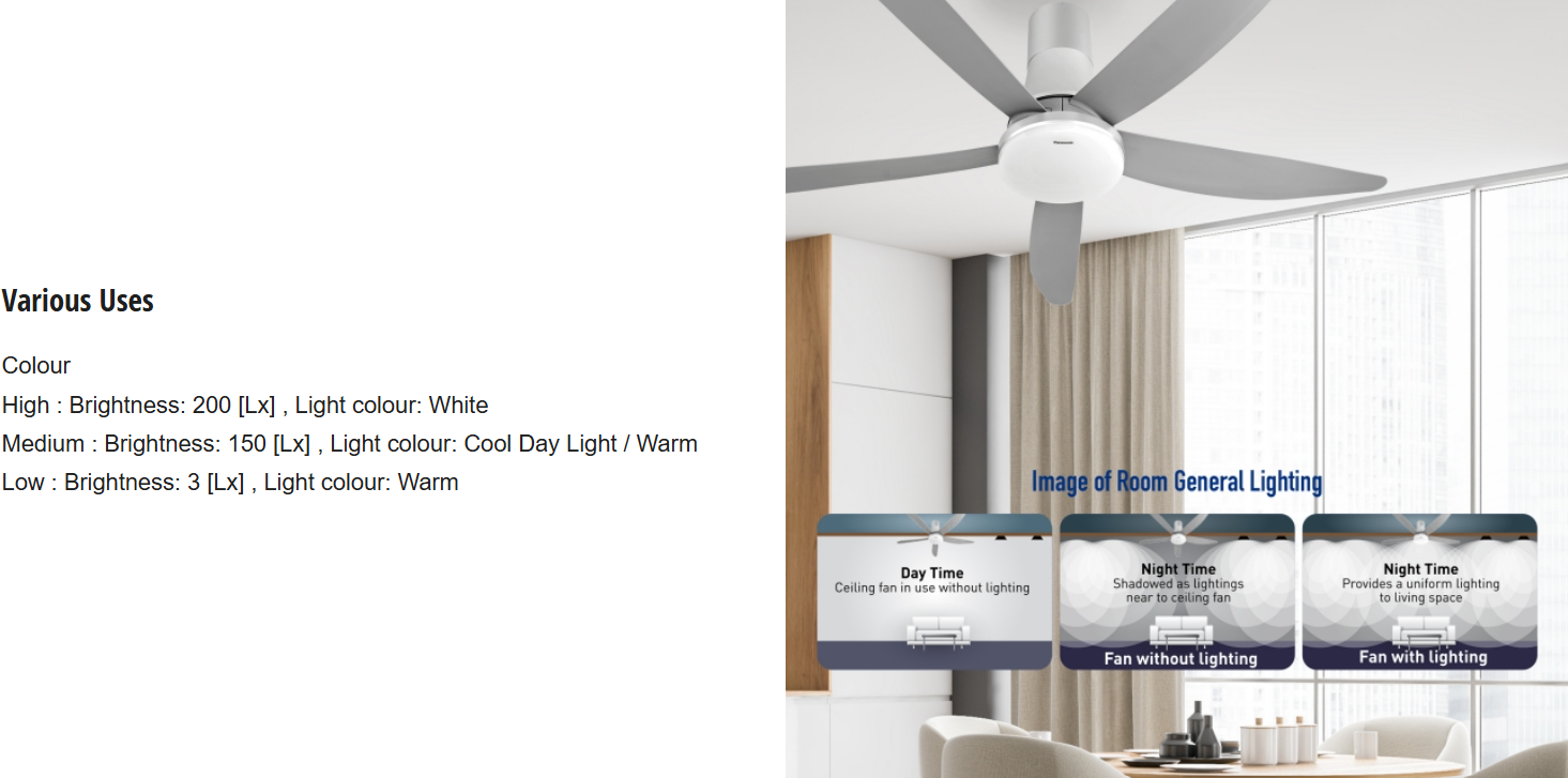 LED lighting built into the ceiling fan is used due to its long lifespan and also simply because it is energy saving. 85% Energy Saving* & with the long lifespan of LED light, there is no need to constantly change your light bulb and reduce garbage waste.