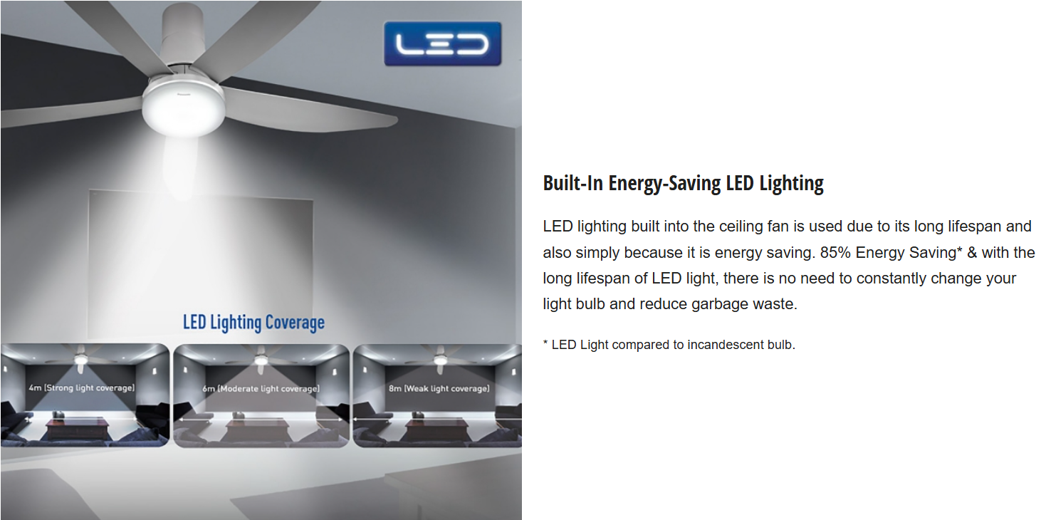 LED lighting built into the ceiling fan is used due to its long lifespan and also simply because it is energy saving. 85% Energy Saving* & with the long lifespan of LED light, there is no need to constantly change your light bulb and reduce garbage waste.