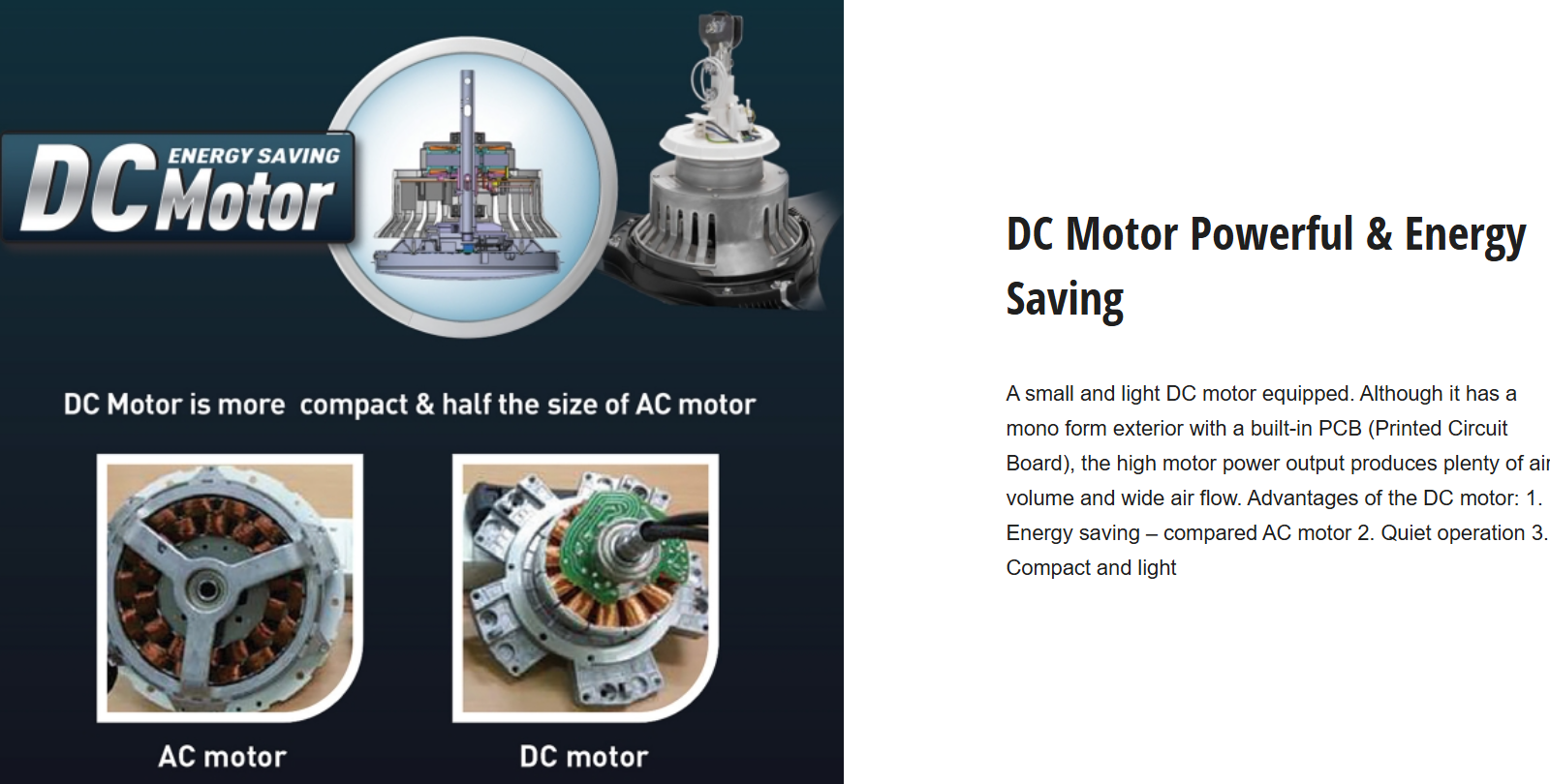 A small and light DC motor equipped. Although it has a mono form exterior with a built-in PCB (Printed Circuit Board), the high motor power output produces plenty of air volume and wide air flow. Advantages of the DC motor: 1. Energy saving – compared AC motor 2. Quiet operation 3. Compact and light