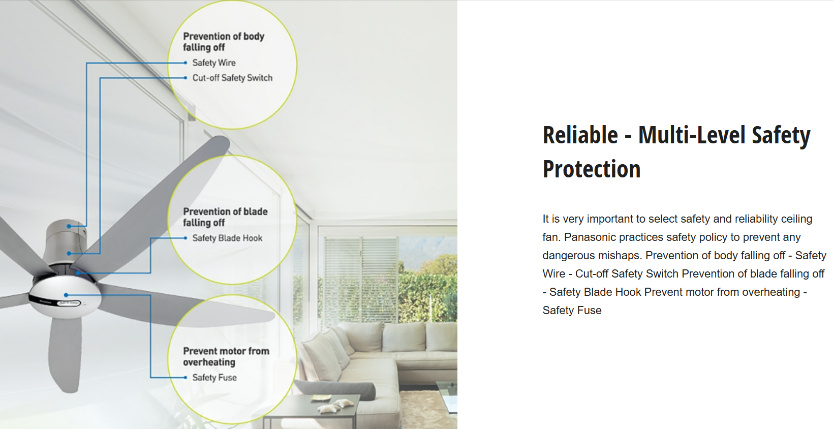 It is very important to select safety and reliability ceiling fan. Panasonic practices safety policy to prevent any dangerous mishaps. Prevention of body falling off - Safety Wire - Cut-off Safety Switch Prevention of blade falling off - Safety Blade Hook Prevent motor from overheating - Safety Fuse