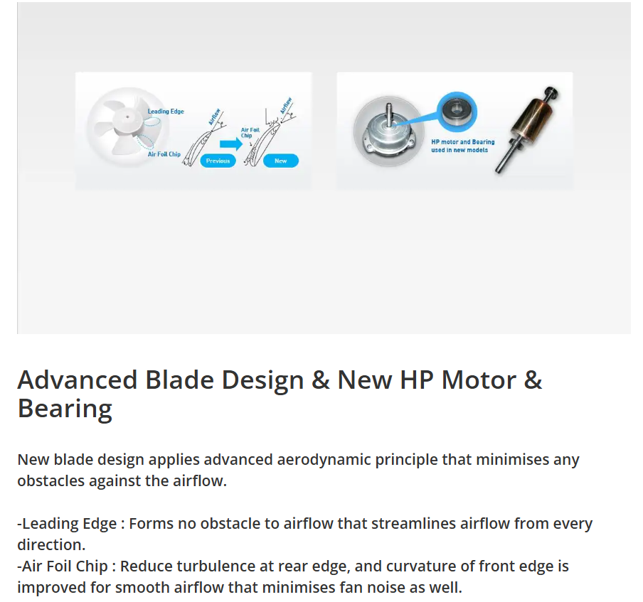 New blade design applies advanced aerodynamic principle that optimizes the design of blade shape. Also, it can lower the noise and increase the airflow.