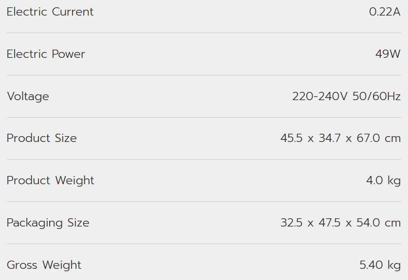 - Certified safety MS 1220 : 2010, MS IEC 60335-1 : 2015, MS 1597 : PART 2-80 : 2010 from SIRIM Malaysia