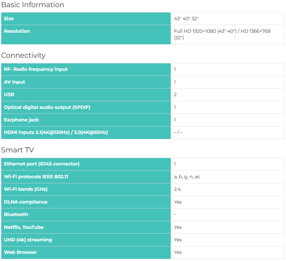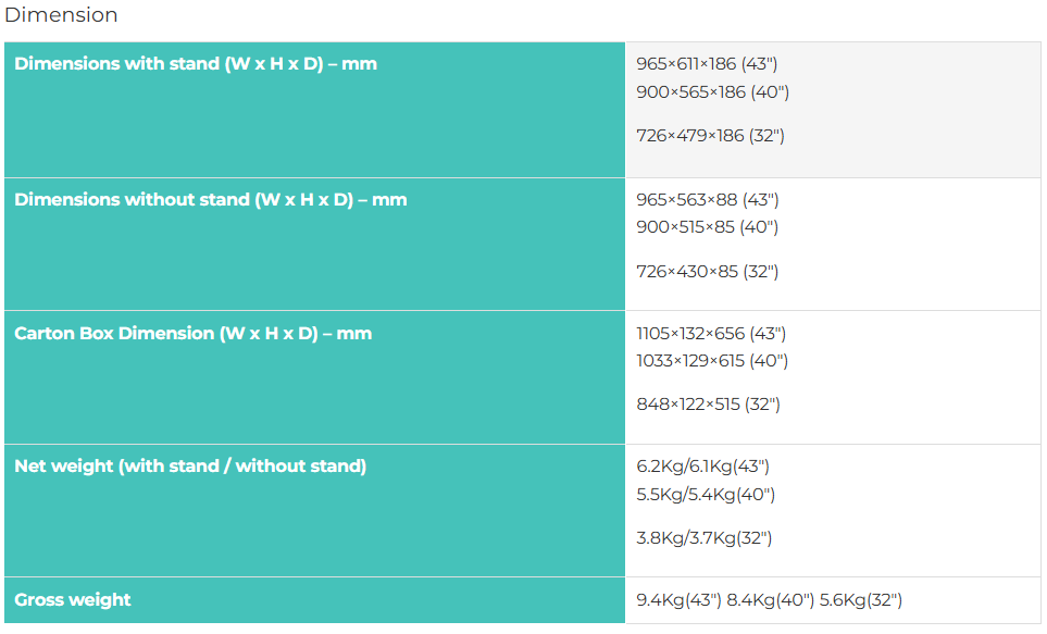 Resolution | Full HD 1920×1080 (43″ 40″) / HD 1366×768 (32″) |