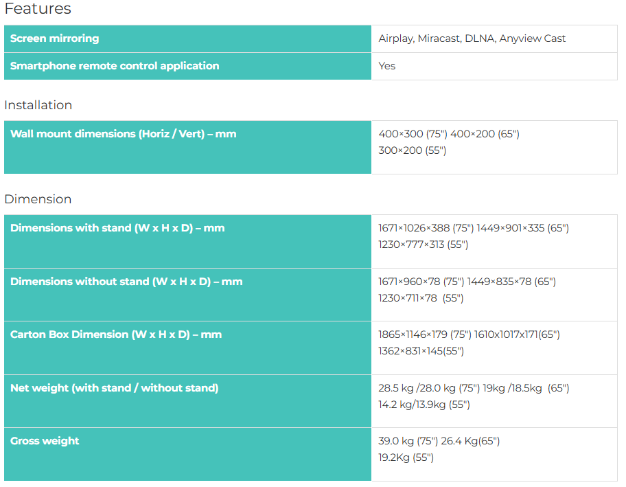 Wall mount dimensions (Horiz / Vert) – mm | 600×400 (98″)/ 400 / 200 (65″) 300/200 (55″) |
