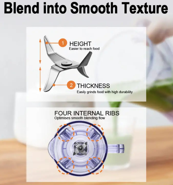 The stainless steel Saber Blades ensure even mixing, while four internal ribs maintain flow consistency, crushing ingredients evenly.