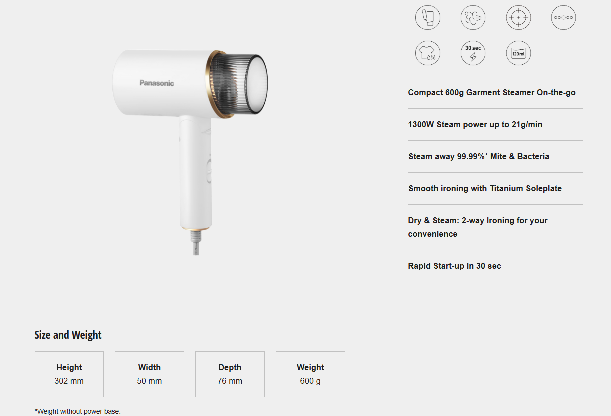 PANASONIC 1300W LIGHTWEIGHT AND FOLDABLE HANDHELD GARMENT STEAMER NI-GHF025WSK