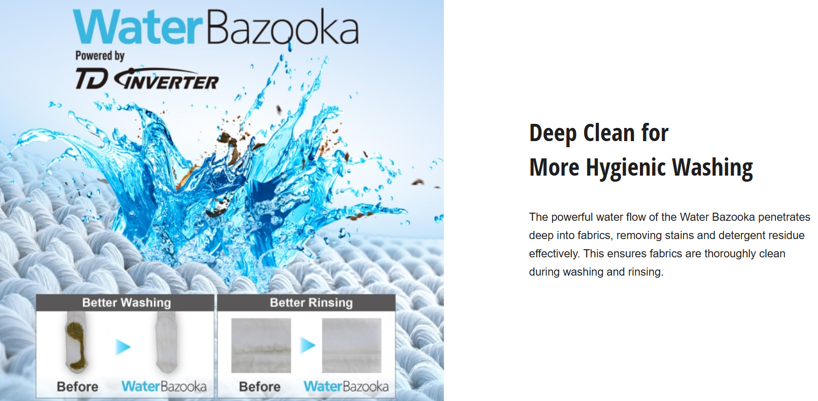 The powerful water flow of the Water Bazooka penetrates deep into fabrics, removing stains and detergent residue effectively. This ensures fabrics are thoroughly clean during washing and rinsing.