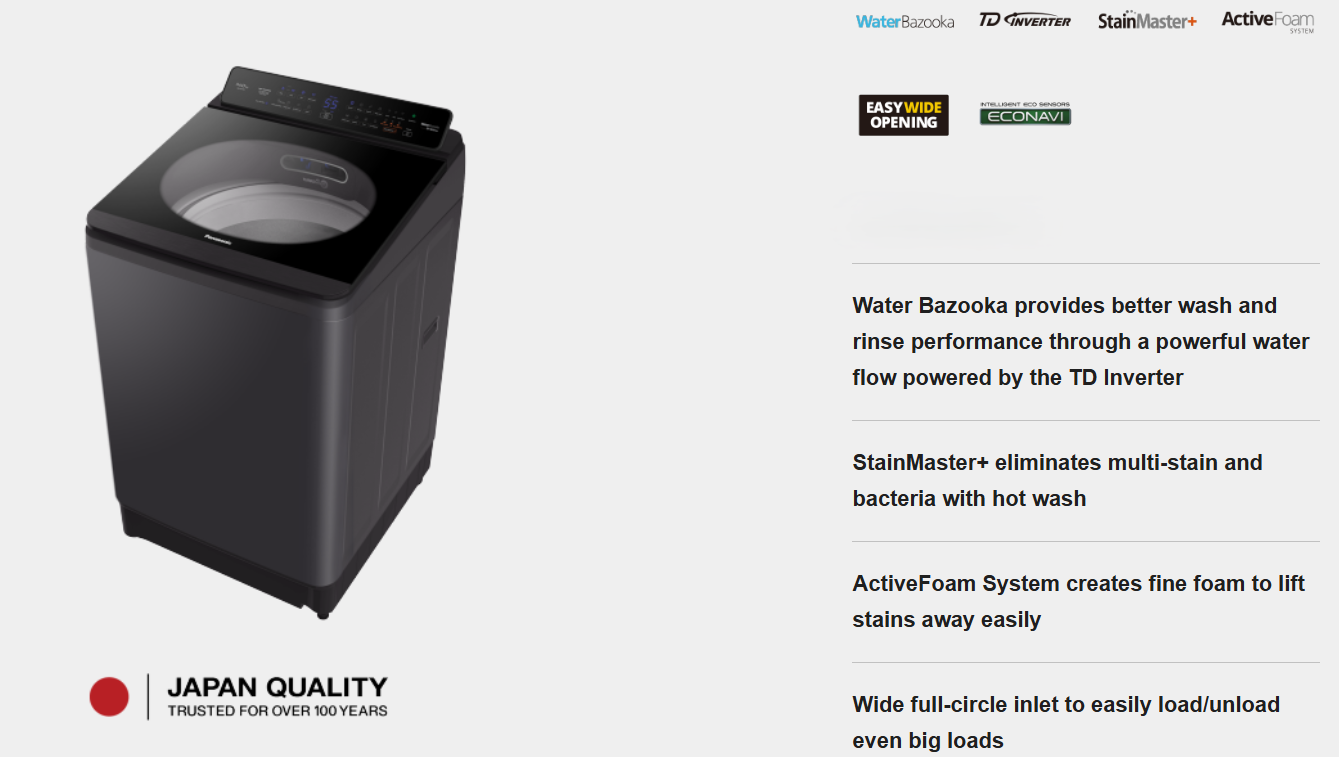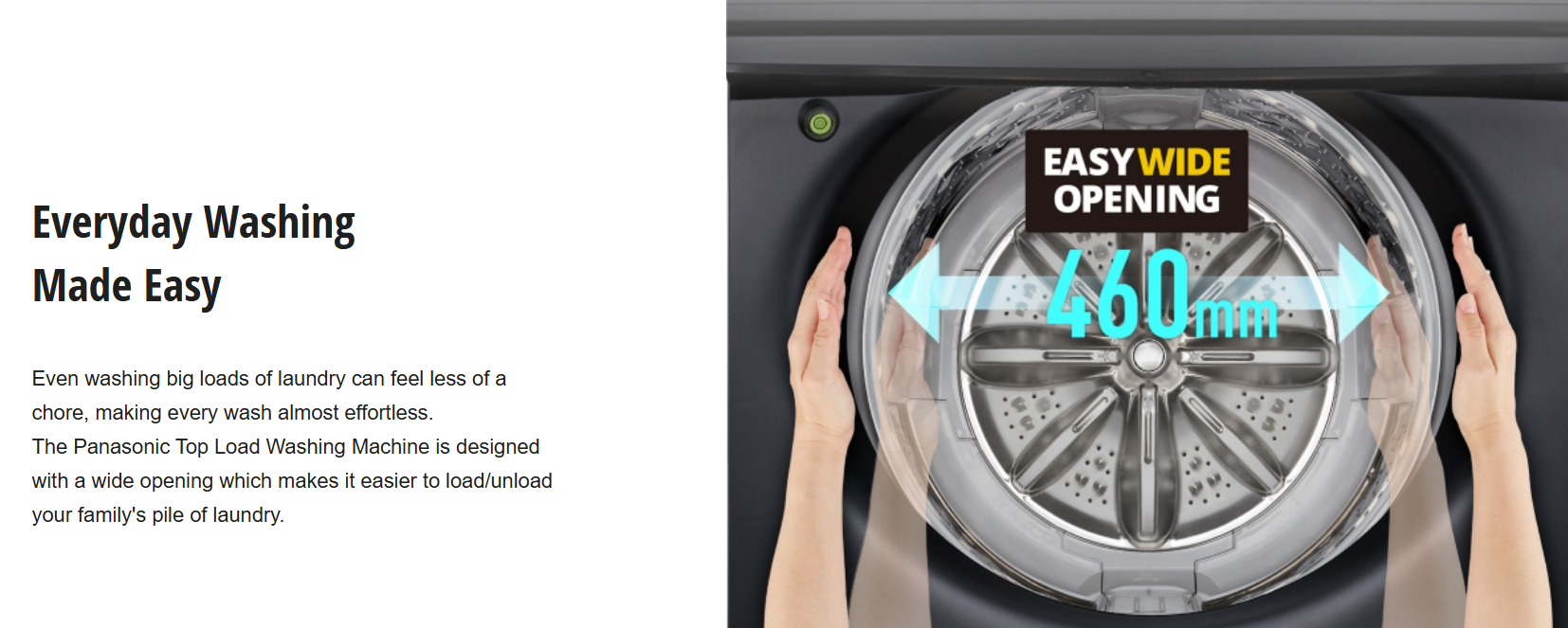 Even washing big loads of laundry can feel less of a chore, making every wash almost effortless. The Panasonic Top Load Washing Machine is designed with a wide opening which makes it easier to load/unload your family's pile of laundry.