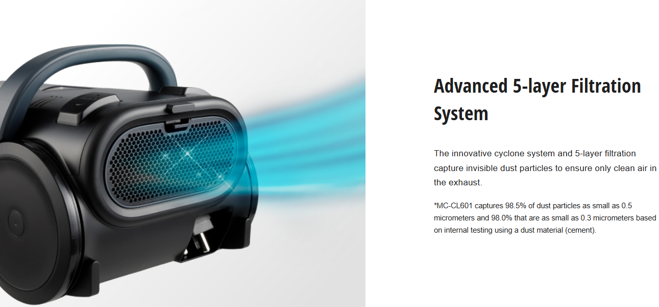 *MC-CL601 captures 98.5% of dust particles as small as 0.5 micrometers and 98.0% that are as small as 0.3 micrometers based on internal testing using a dust material (cement).
