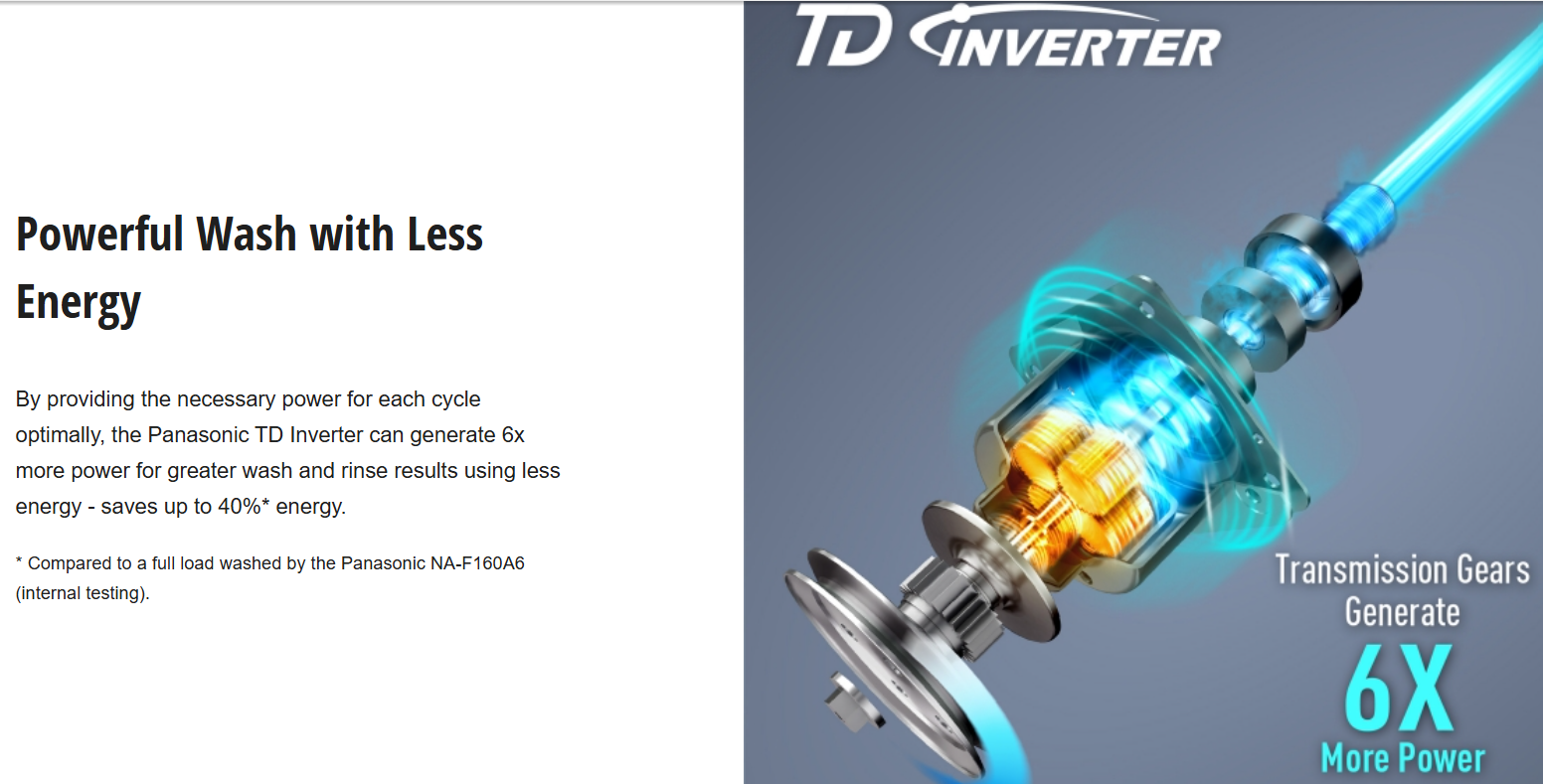 By providing the necessary power for each cycle optimally, the Panasonic TD Inverter can generate 6x more power for greater wash and rinse results using less energy - saves up to 40%* energy.