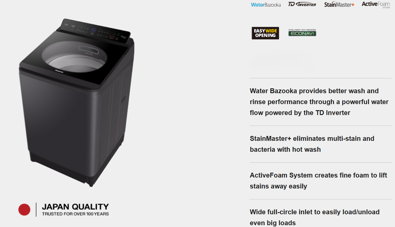 Even washing big loads of laundry can feel less of a chore, making every wash almost effortless. The Panasonic Top Load Washing Machine is designed with a wide opening which makes it easier to load/unload your family's pile of laundry.