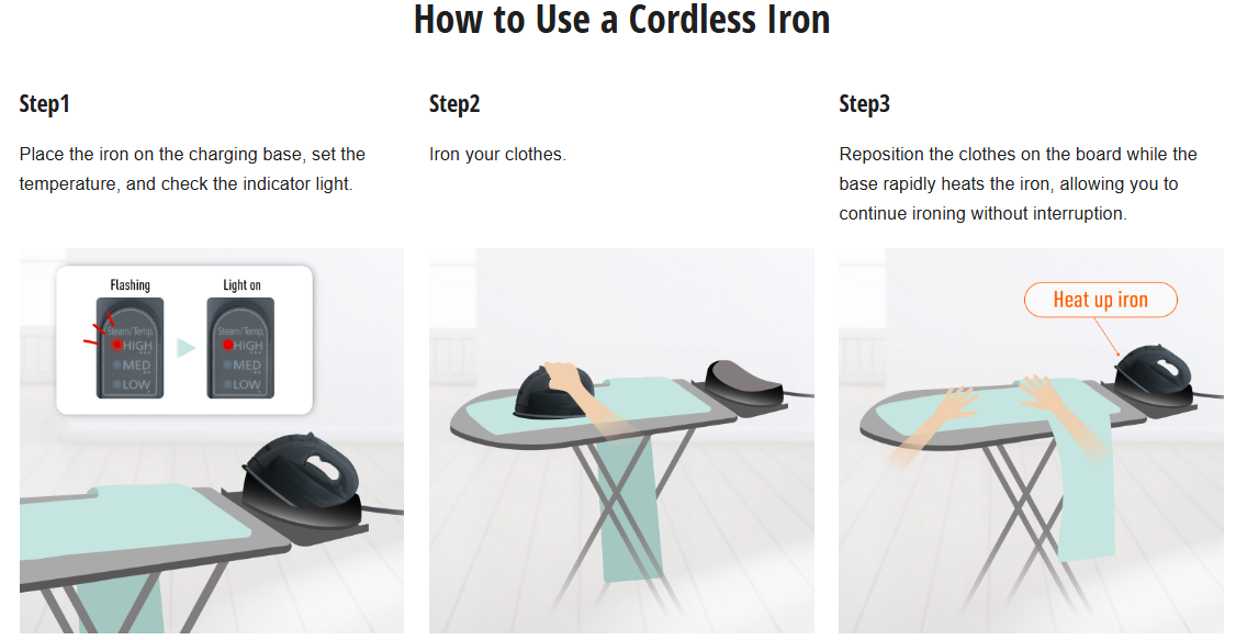 A cordless iron makes your ironing smooth, effortless and fun. You can move it freely without worrying about the cord. Refresh your favorite clothes swiftly, and enjoy the feel of dressing neatly.