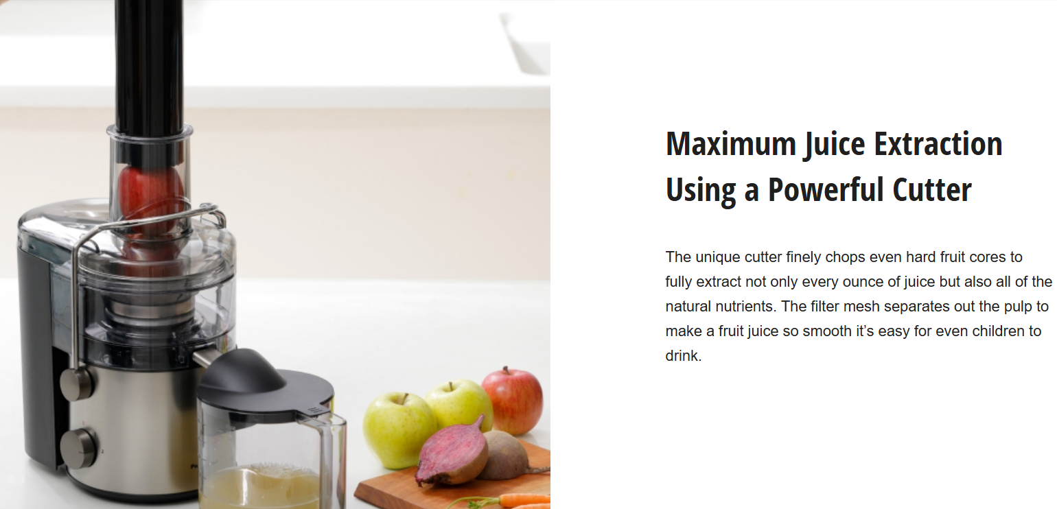 The unique cutter finely chops even hard fruit cores to fully extract not only every ounce of juice but also all of the natural nutrients. The filter mesh separates out the pulp to make a fruit juice so smooth it’s easy for even children to drink.