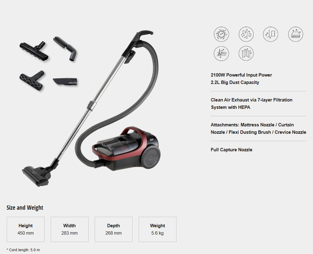 PANASONIC 2100W CYCLONE BAGLESS VACUUM CLEANER WITH HEPA FILTER MC-CL607RV47