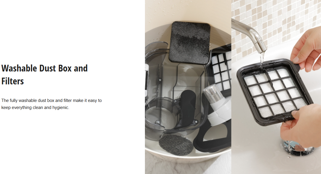 The fully washable dust box and filter make it easy to keep everything clean and hygienic.