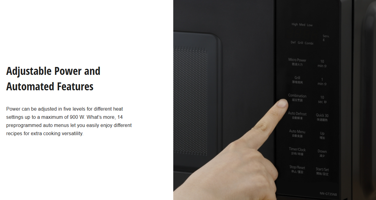 Power can be adjusted in five levels for different heat settings up to a maximum of 900 W. What’s more, 14 preprogrammed auto menus let you easily enjoy different recipes for extra cooking versatility.