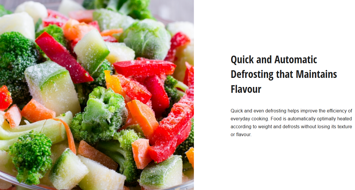 Quick and even defrosting helps improve the efficiency of everyday cooking. Food is automatically optimally heated according to weight and defrosts without losing its texture or flavour.