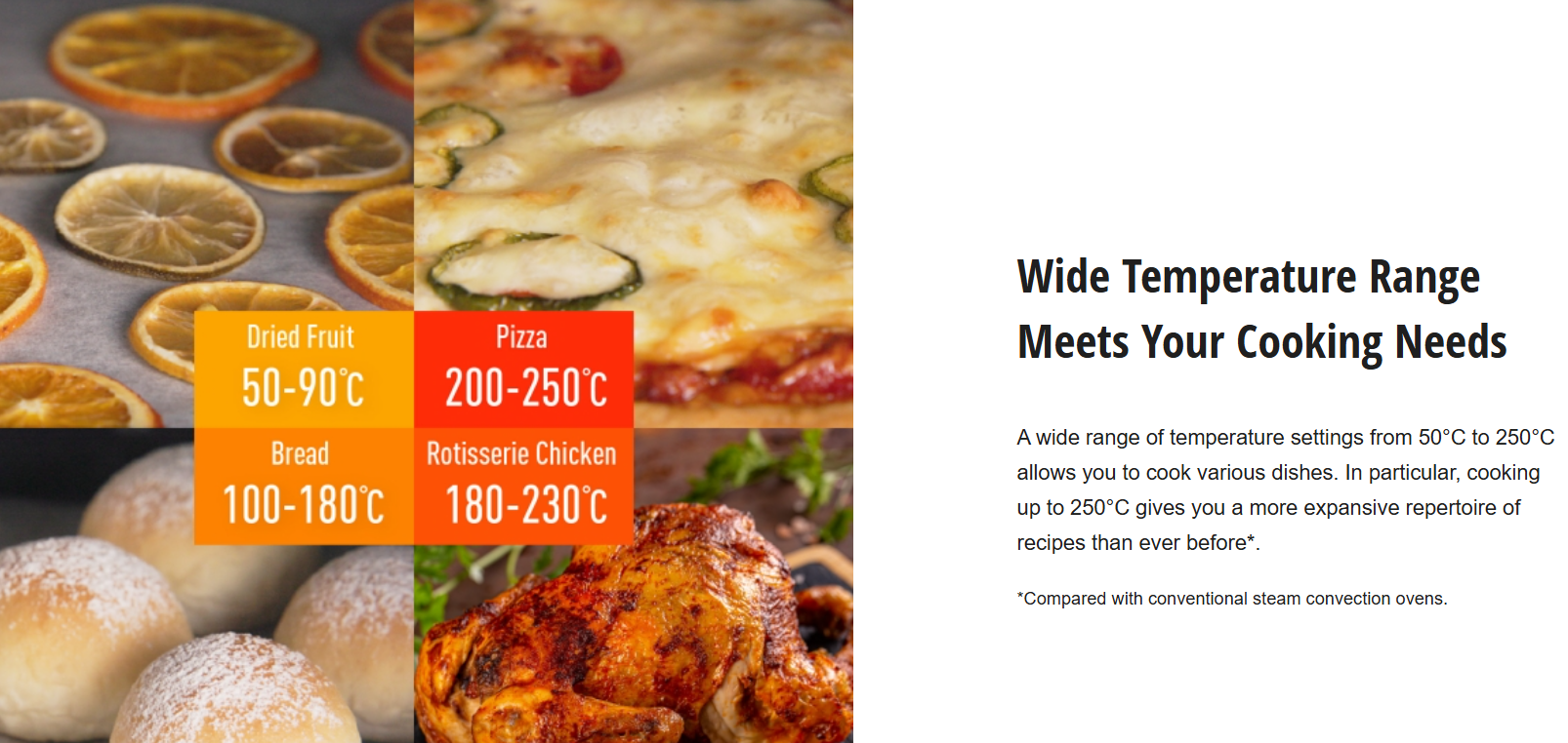 A wide range of temperature settings from 50°C to 250°C allows you to cook various dishes. In particular, cooking up to 250°C gives you a more expansive repertoire of recipes than ever before*.