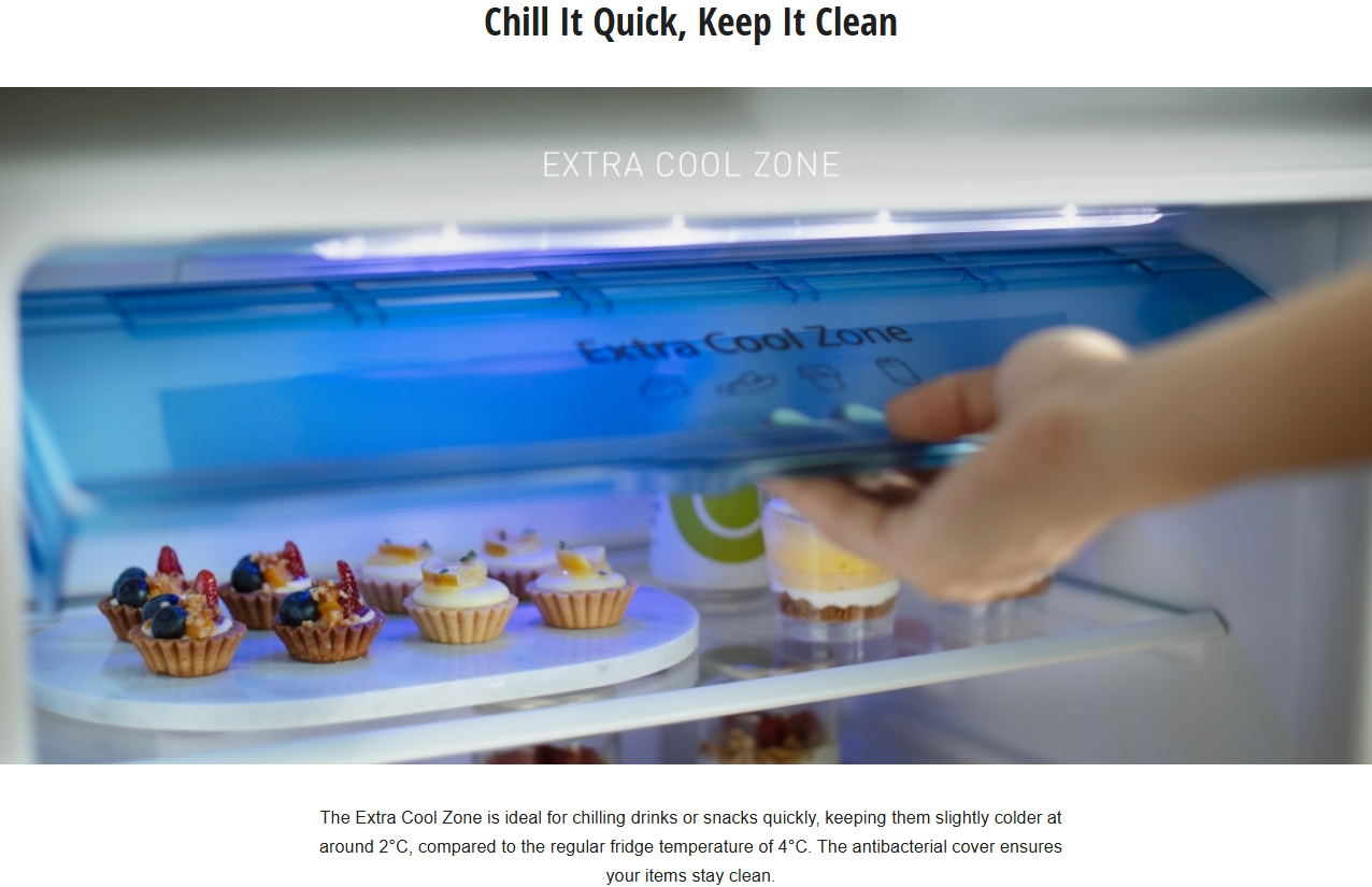The Extra Cool Zone is ideal for chilling drinks or snacks quickly, keeping them slightly colder at around 2°C, compared to the regular fridge temperature of 4°C. The antibacterial cover ensures your items stay clean.