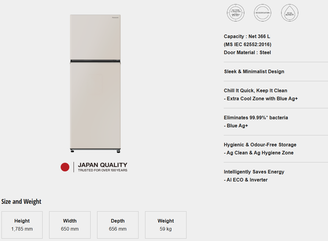 PANASONIC 366L INVERTER 2 DOOR REFRIGERATOR NR-TL381BWCM