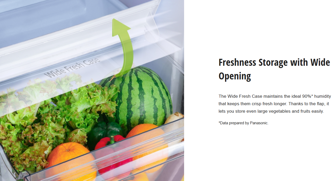 The Wide Fresh Case maintains the ideal 90%* humidity that keeps them crisp fresh longer. Thanks to the flap, it lets you store even large vegetables and fruits easily.