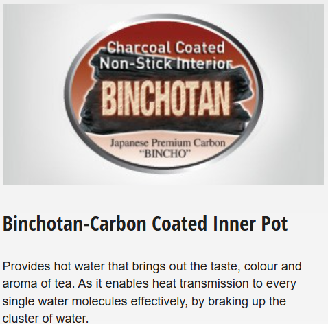 Provides hot water that brings out the taste, colour and aroma of tea. As it enables heat transmission to every single water molecules effectively, by braking up the cluster of water.