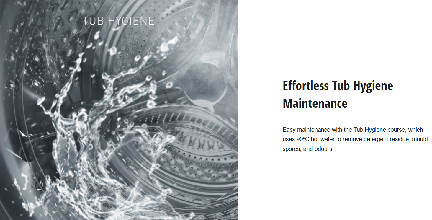 Easy maintenance with the Tub Hygiene course, which uses 90ºC hot water to remove detergent residue, mould spores, and odours.