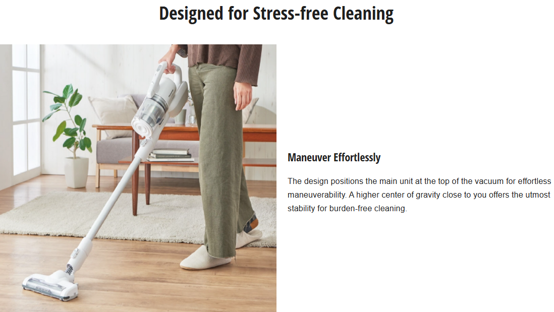 The design positions the main unit at the top of the vacuum for effortless maneuverability. A higher center of gravity close to you offers the utmost stability for burden-free cleaning.