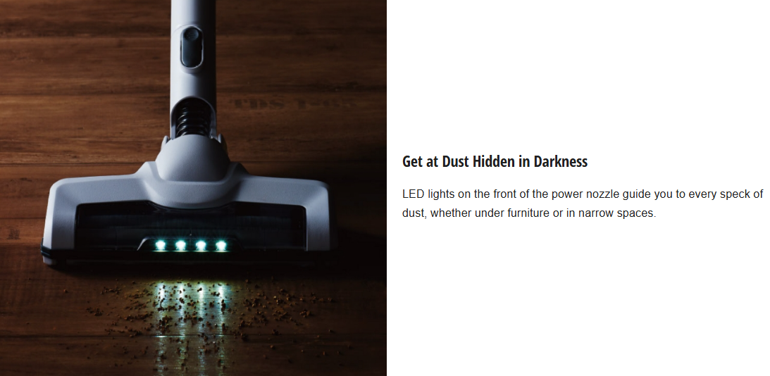 LED lights on the front of the power nozzle guide you to every speck of dust, whether under furniture or in narrow spaces.
