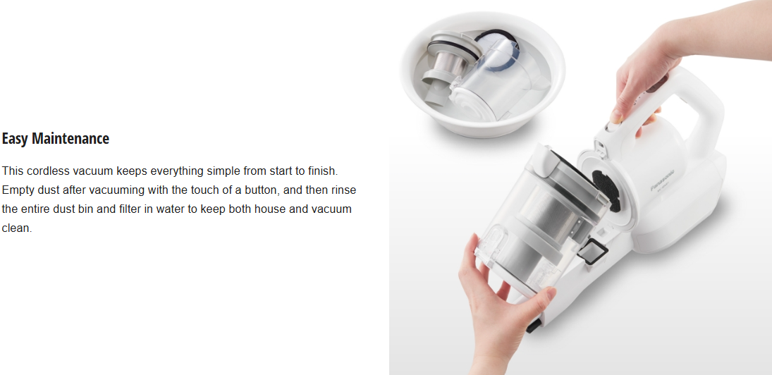 This cordless vacuum keeps everything simple from start to finish. Empty dust after vacuuming with the touch of a button, and then rinse the entire dust bin and filter in water to keep both house and vacuum clean.