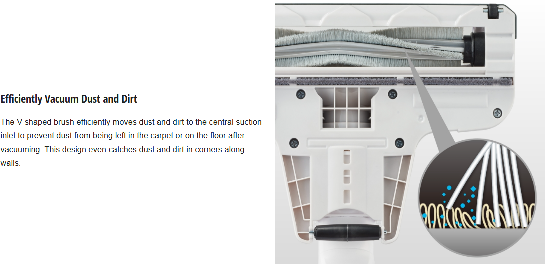 The V-shaped brush efficiently moves dust and dirt to the central suction inlet to prevent dust from being left in the carpet or on the floor after vacuuming. This design even catches dust and dirt in corners along walls.