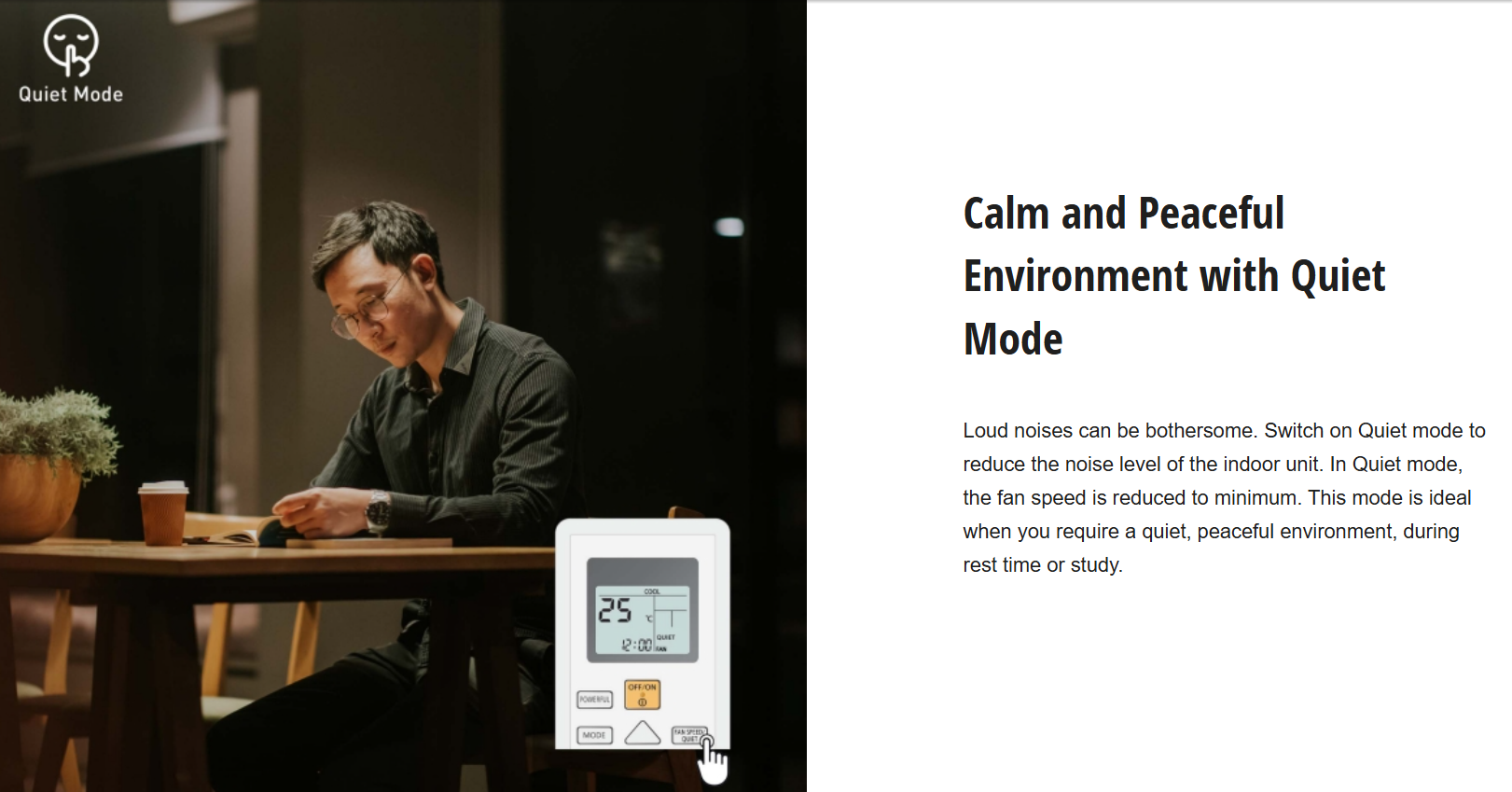 Loud noises can be bothersome. Switch on Quiet mode to reduce the noise level of the indoor unit. In Quiet mode, the fan speed is reduced to minimum. This mode is ideal when you require a quiet, peaceful environment, during rest time or study.