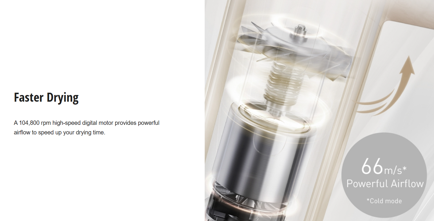 A 104,800 rpm high-speed digital motor provides powerful airflow to speed up your drying time.