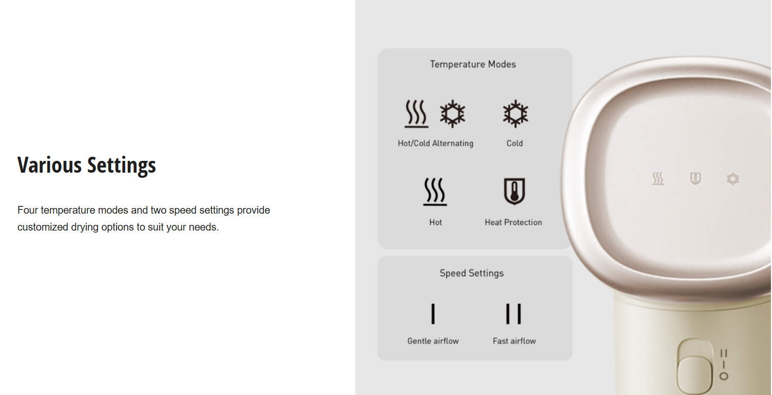 Four temperature modes and two speed settings provide customized drying options to suit your needs.