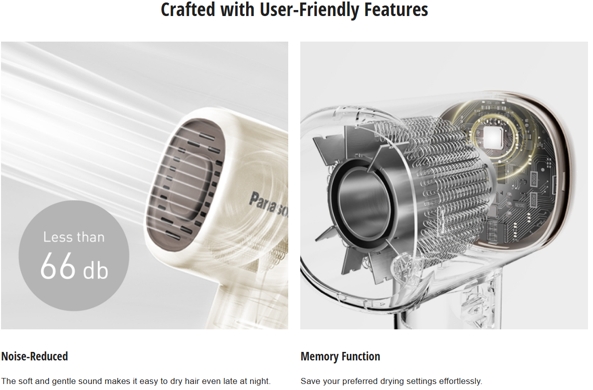 The soft and gentle sound makes it easy to dry hair even late at night.