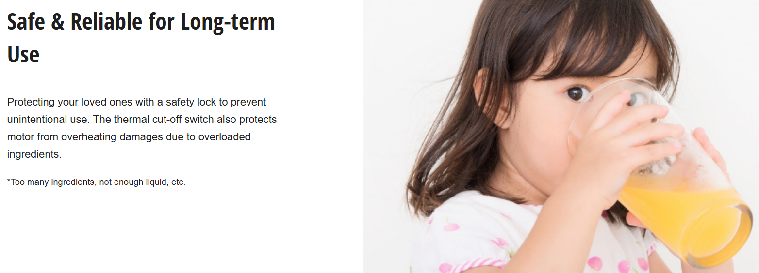 Protecting your loved ones with a safety lock to prevent unintentional use. The thermal cut-off switch also protects motor from overheating damages due to overloaded ingredients.
