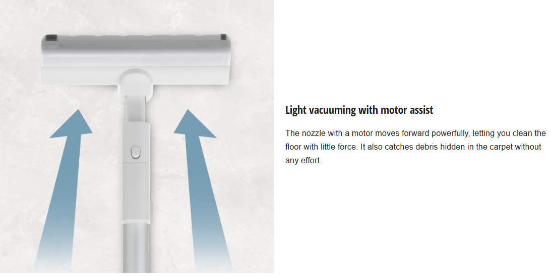 The nozzle with a motor moves forward powerfully, letting you clean the floor with little force. It also catches debris hidden in the carpet without any effort.