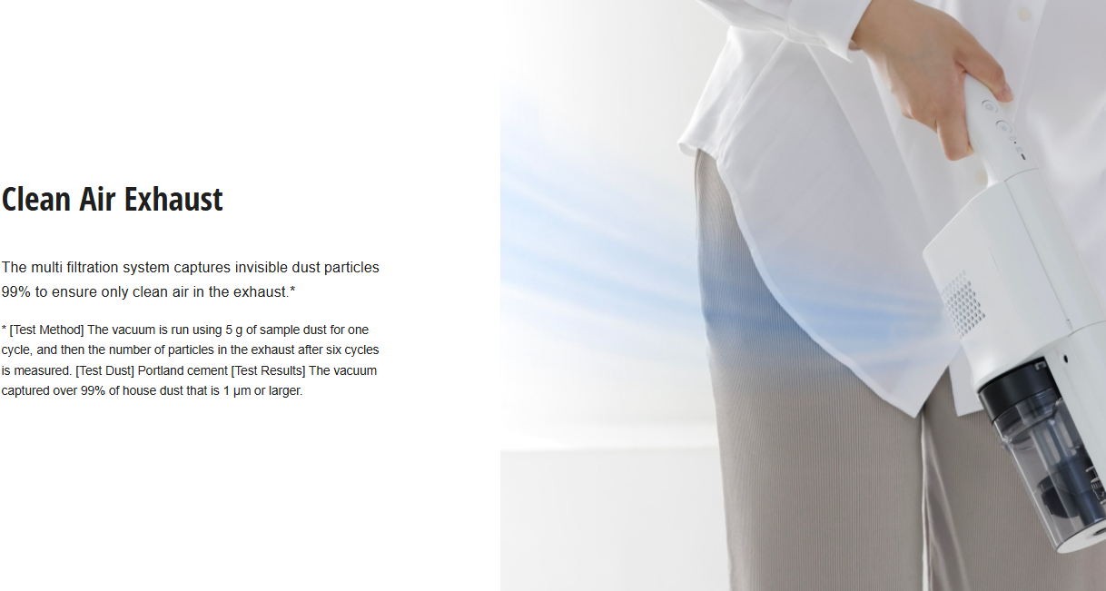 * [Test Method] The vacuum is run using 5 g of sample dust for one cycle, and then the number of particles in the exhaust after six cycles is measured. [Test Dust] Portland cement [Test Results] The vacuum captured over 99% of house dust that is 1 μm or larger.