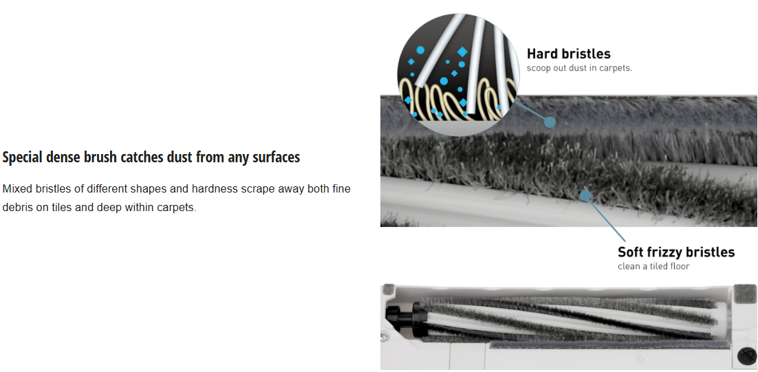 Mixed bristles of different shapes and hardness scrape away both fine debris on tiles and deep within carpets.
