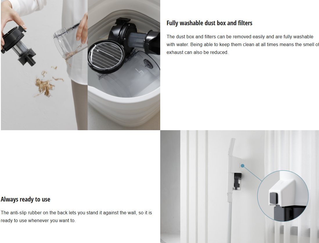 The dust box and filters can be removed easily and are fully washable with water. Being able to keep them clean at all times means the smell of exhaust can also be reduced.