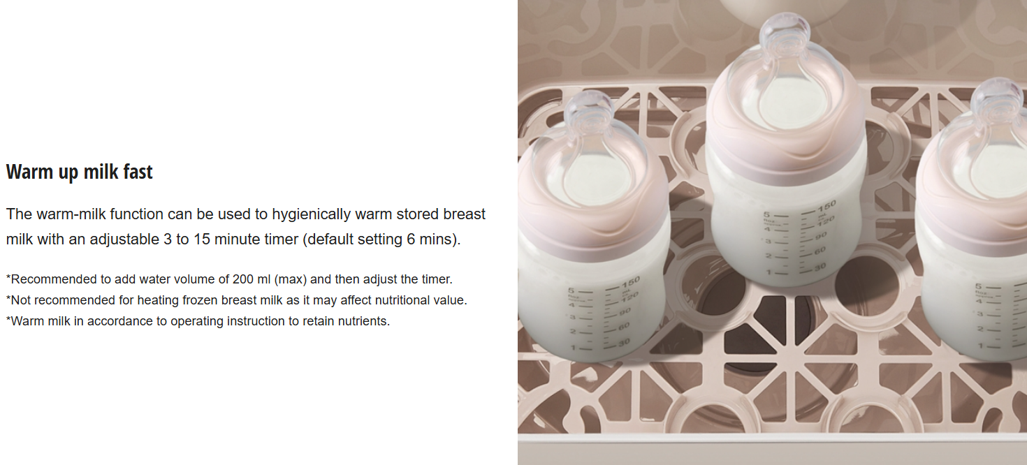 The warm-milk function can be used to hygienically warm stored breast milk with an adjustable 3 to 15 minute timer (default setting 6 mins).