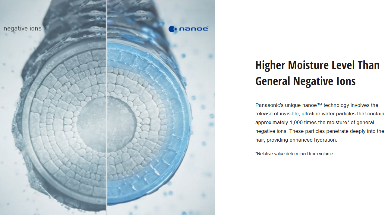 Panasonic's unique nanoe™ technology involves the release of invisible, ultrafine water particles that contain approximately 1,000 times the moisture* of general negative ions. These particles penetrate deeply into the hair, providing enhanced hydration.