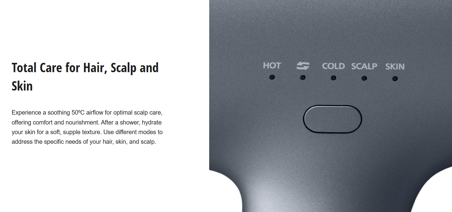 Experience a soothing 50ºC airflow for optimal scalp care, offering comfort and nourishment. After a shower, hydrate your skin for a soft, supple texture. Use different modes to address the specific needs of your hair, skin, and scalp.