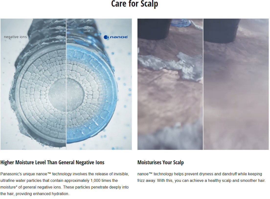 Panasonic's unique nanoe™ technology involves the release of invisible, ultrafine water particles that contain approximately 1,000 times the moisture* of general negative ions. These particles penetrate deeply into the hair, providing enhanced hydration.
