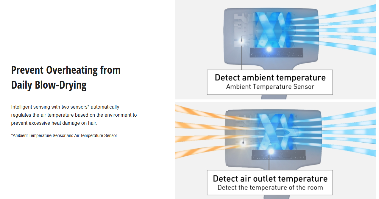 Intelligent sensing with two sensors* automatically regulates the air temperature based on the environment to prevent excessive heat damage on hair.