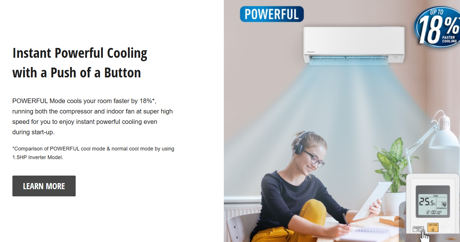 Panasonic Standard Inverter PU Series (AKH-1) features POWERFUL Mode for instant powerful cooling with just a push of a button. BIG FLAP/AEROWINGS* directs airflow further across the room. Stay connected with Panasonic Comfort Cloud App (optional network adaptor is required) to manage your air conditioners from one mobile device. Achieve energy efficiency without compromising comfort with ECO Mode with A.I. Control, Inverter technology, and R32 refrigerant.