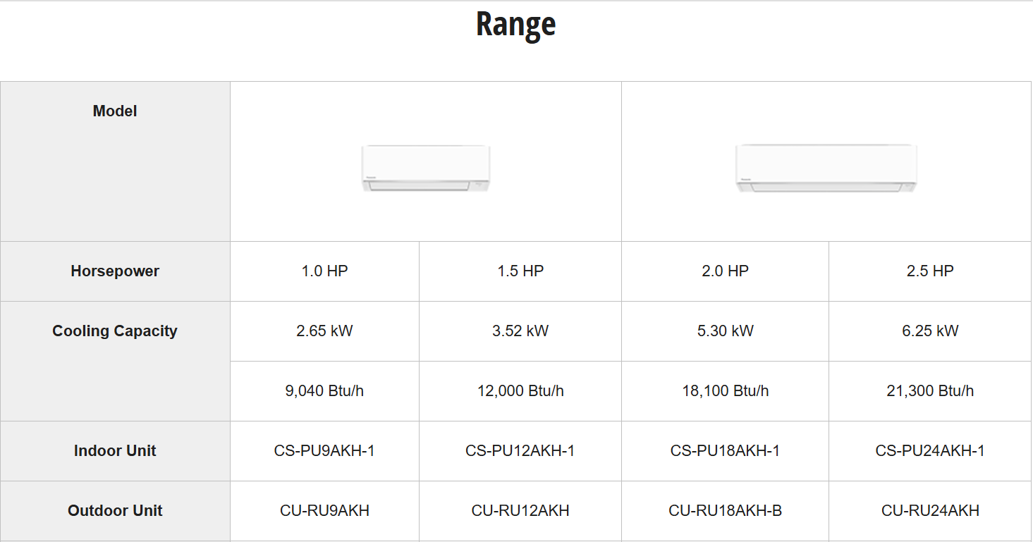Panasonic Standard Inverter PU Series (AKH-1) features POWERFUL Mode for instant powerful cooling with just a push of a button. BIG FLAP/AEROWINGS* directs airflow further across the room. Stay connected with Panasonic Comfort Cloud App (optional network adaptor is required) to manage your air conditioners from one mobile device. Achieve energy efficiency without compromising comfort with ECO Mode with A.I. Control, Inverter technology, and R32 refrigerant.