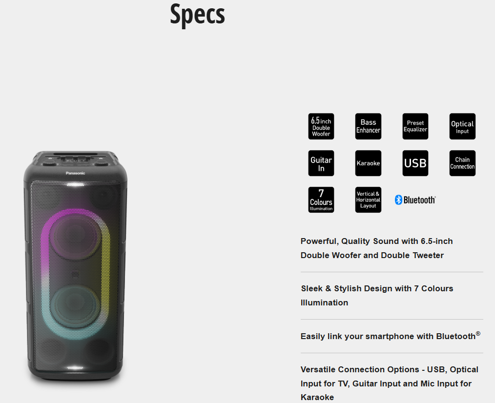 The systems packs the punch of 6.5-inch double woofer, double tweeter and bass reflex ports for vivid sound quality across all frequencies. Experience a well-balanced sound from deep bass to crystal clear vocals with high notes, from just one setup.
